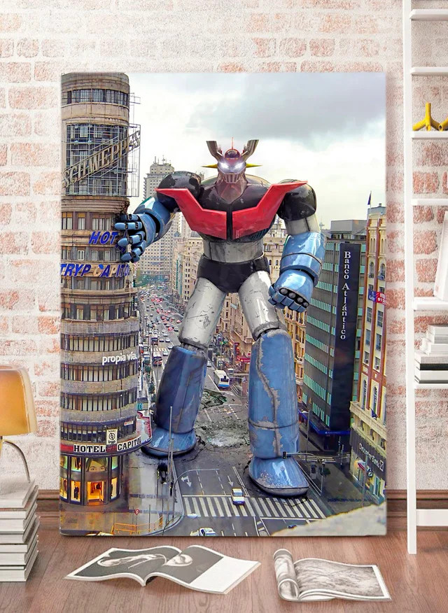 Sorprendente Mazinger en la Gran Via de Madrid. Se trata de una lona impresa de alta calidad. No lleva ningún bastidor ni ninguna estructura de madera. Medidas 78 x 118 cm. Ideal para decorar cualquier espacio. Le puedes hacer un bastidor con listones de madera o ponerle el que venden en Ikea Marco Bjorksta. Estado: Nuevo